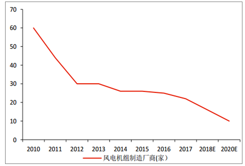 今年以來風電機組招標價格延續 2017年下跌趨勢, 2018一季度 2.0MW風電機組市場投標均價下降至 3300-3400 元/kW 左右,近一年累計降幅為 13.3%。 2.5MW 逐步成為市場主流機型,價格下降至 3484 元/kW,近一年累計降幅 15%。回溯上一輪價格戰,發生在2010-2011 年以 1.5MW 機型為主戰場,國內風電機組制造商從 60 家迅速下滑至 30 家。