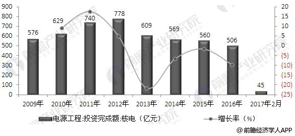 近年來(lái),我國(guó)核電的電源工程投資完成額呈波動(dòng)變化態(tài)勢(shì)。據(jù)前瞻產(chǎn)業(yè)研究院發(fā)布的《核電行業(yè)市場(chǎng)前瞻與投資戰(zhàn)略規(guī)劃分析報(bào)告》數(shù)據(jù)顯示,2016年,我國(guó)核電的電源工程投資完成額為506億元,較上年同比下滑9.64%;據(jù)最新統(tǒng)計(jì),2017年1-2月,核電電源工程投資為45億元。