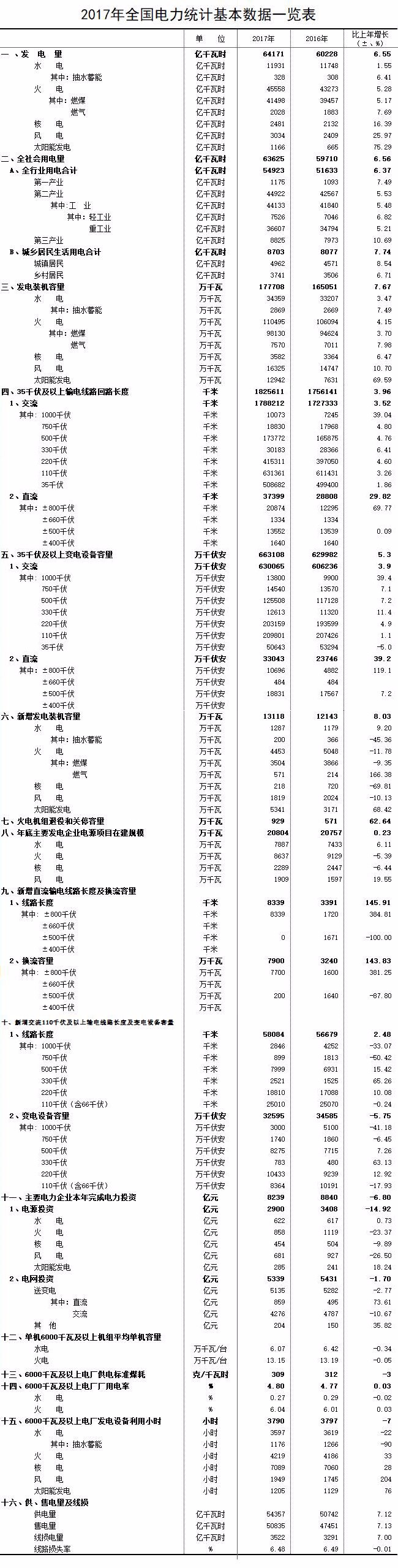 日前中電聯行業發展與環境資源部發布了《2017年電力統計基本數據一覽表》,數據顯示2017年全社會用電量為63625億千瓦時,比2016年增長6.56%;主要電力企業本年完成電力投資共計8239億元,比2016年減少6.8億元。詳情如下: