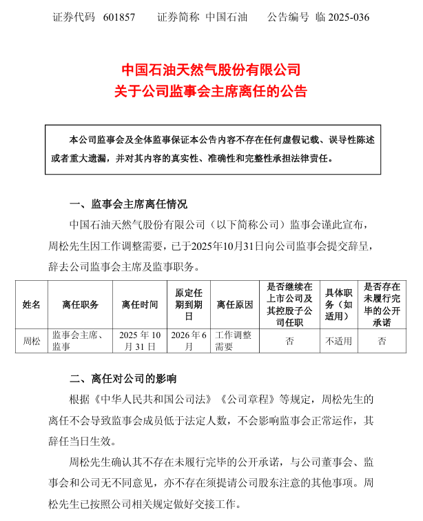 中國石油發(fā)布公告稱,公司監(jiān)事會宣布,周松先生因工作調(diào)整需要,已于2025年10月31日向公司監(jiān)事會提交辭呈,辭去公司監(jiān)事會主席及監(jiān)事職務。