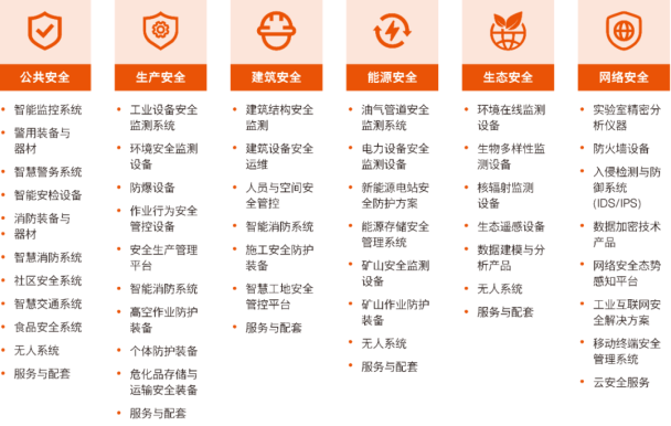 生產安全: 工業設備安全監測系統、環境安全監測設備、防爆設備、作業行為安全管控設備、安全生產管理平臺、智能消防系統、高空作業防護裝備、個體防護裝備、危化品存儲與運輸安全裝備、服務與配套
