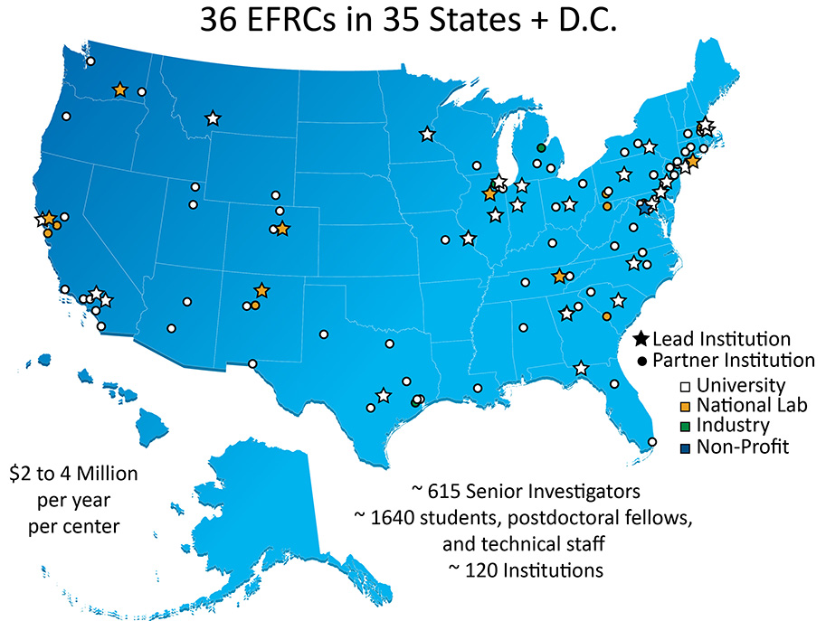 EFRC計(jì)劃由能源部(DOE)的科學(xué)辦公室于2009年建立,匯集了來(lái)自多個(gè)學(xué)科和機(jī)構(gòu)的研究人員,包括大學(xué),國(guó)家實(shí)驗(yàn)室和非營(yíng)利組織,并將他們組合成協(xié)同,高效的團(tuán)隊(duì)。