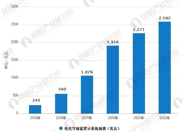 2016-2022年我國(guó)電化學(xué)儲(chǔ)能累計(jì)裝機(jī)規(guī)模統(tǒng)計(jì)情況及預(yù)測(cè)