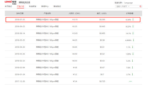 這已經是隆基年內第九次正式下調單晶硅片的價格。相比2017年末報價5.4元,截止目前,180μm厚度P型M2單晶硅片已降低71.4%。可以看到,相比上半年的平緩降價,新政過后,隆基的三次調價力度都很大,以6月14日新政后第一次調價隆基降價最為陡峭。