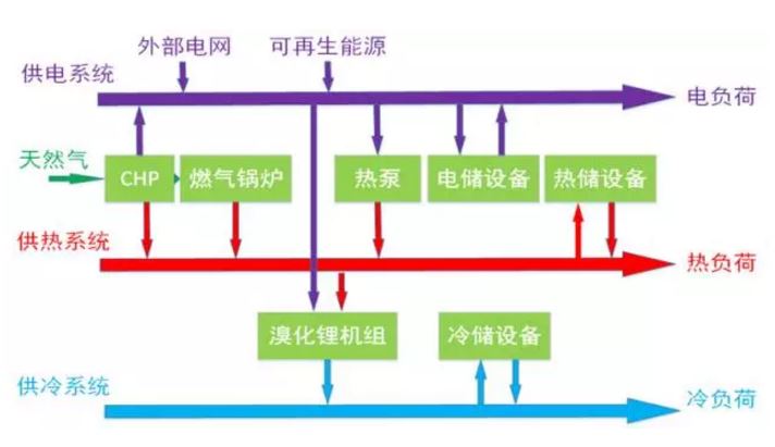 橫向來看依次是源網(wǎng)荷儲(chǔ)。源側(cè)包括常規(guī)的供電設(shè)備、CHP機(jī)組、燃?xì)忮仩t等設(shè)備,以及外部電網(wǎng)供電、可再生能源接入;網(wǎng)架分為冷熱電等傳輸系統(tǒng);荷側(cè)為園區(qū)內(nèi)部的電、熱、冷負(fù)荷;在儲(chǔ)能方面,不同能源子系統(tǒng)均有各自的儲(chǔ)能設(shè)備。縱向來看依次是電、氣、熱、冷多能互補(bǔ)運(yùn)行。不同的能源子系統(tǒng)分別用不同的顏色表示,多種能源轉(zhuǎn)化設(shè)備(熱泵、CHP、燃?xì)忮仩t、溴化鋰機(jī)組)將不同的能源子系統(tǒng)相耦合。園區(qū)內(nèi)部多種能源形式以虛擬電廠的形式組合在一起綜合運(yùn)行,在保證電、熱、冷負(fù)荷可靠供應(yīng)的前提下,實(shí)現(xiàn)了能源的梯級(jí)利用,提高能效,降低用能成本。并且對(duì)于波動(dòng)性很強(qiáng)的可再生能源而言,綜合能源系統(tǒng)具有更多的靈活性,促進(jìn)了可再生能源的接納,進(jìn)一步提高系統(tǒng)經(jīng)濟(jì)性。
