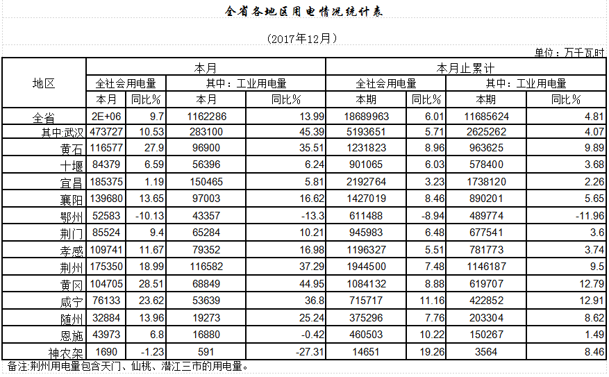 全省14個(gè)用電統(tǒng)計(jì)地區(qū)中,武漢等13個(gè)地區(qū)全社會(huì)用電同比增長(zhǎng),其中咸寧、恩施、神農(nóng)架林區(qū)3地全社會(huì)用電增幅在兩位數(shù)以上。各地工業(yè)用電基本與全社會(huì)用電同步增長(zhǎng),僅鄂州市受鋼鐵行業(yè)淘汰落后產(chǎn)能影響工業(yè)用電下降。“一主兩副”城市武漢、宜昌、襄陽3市全社會(huì)用電量占到全省的47.16%,工業(yè)用電量占全省的44.63%,3市全社會(huì)和工業(yè)用電均增幅穩(wěn)健,有力促進(jìn)了全省用電的增長(zhǎng)。