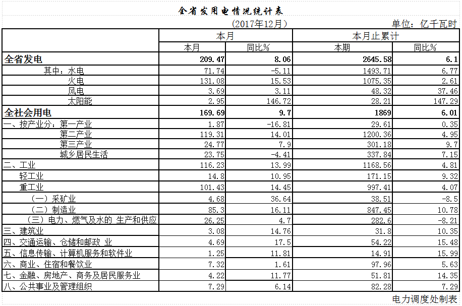2017年,全省用電需求持續(xù)穩(wěn)定增長(zhǎng),各大產(chǎn)業(yè)和城鄉(xiāng)居民生活用電全面增長(zhǎng)。全省電力戰(zhàn)線認(rèn)真貫徹落實(shí)五大發(fā)展理念,以確保全省電力供應(yīng)為中心,以降成本、惠民生為重點(diǎn),團(tuán)結(jié)協(xié)作,克難奮進(jìn),確保了全省電網(wǎng)安全穩(wěn)定運(yùn)行和電力正常供應(yīng),為全省經(jīng)濟(jì)社會(huì)發(fā)展提供了堅(jiān)強(qiáng)的電力支撐。截止年底,全省全口徑裝機(jī)容量7124.48萬千瓦,同比增長(zhǎng)5.62%;全年發(fā)電量2645.58億千瓦時(shí),增長(zhǎng)6.10%;全社會(huì)用電量1869.00億千瓦時(shí),增長(zhǎng)6.01%,其中工業(yè)用電量1168.59億千瓦時(shí),增長(zhǎng)4.81%。