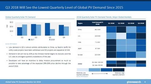 該市場研究公司指出,預計2018年中國光伏需求將從48.2GW的初始年度預測下降至28.8GW。據說中國的突然上限導致了2018年第三季度,創下2015年以來全球光伏需求的最低季度水平。