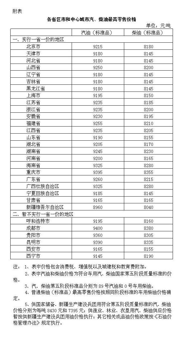附:各省區(qū)市和中心城市汽、柴油最高零售價格