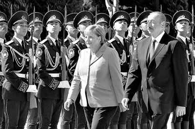 8月25日,在阿塞拜疆首都巴庫,阿塞拜疆總統(tǒng)阿利耶夫(前右)歡迎到訪的德國總理默克爾。