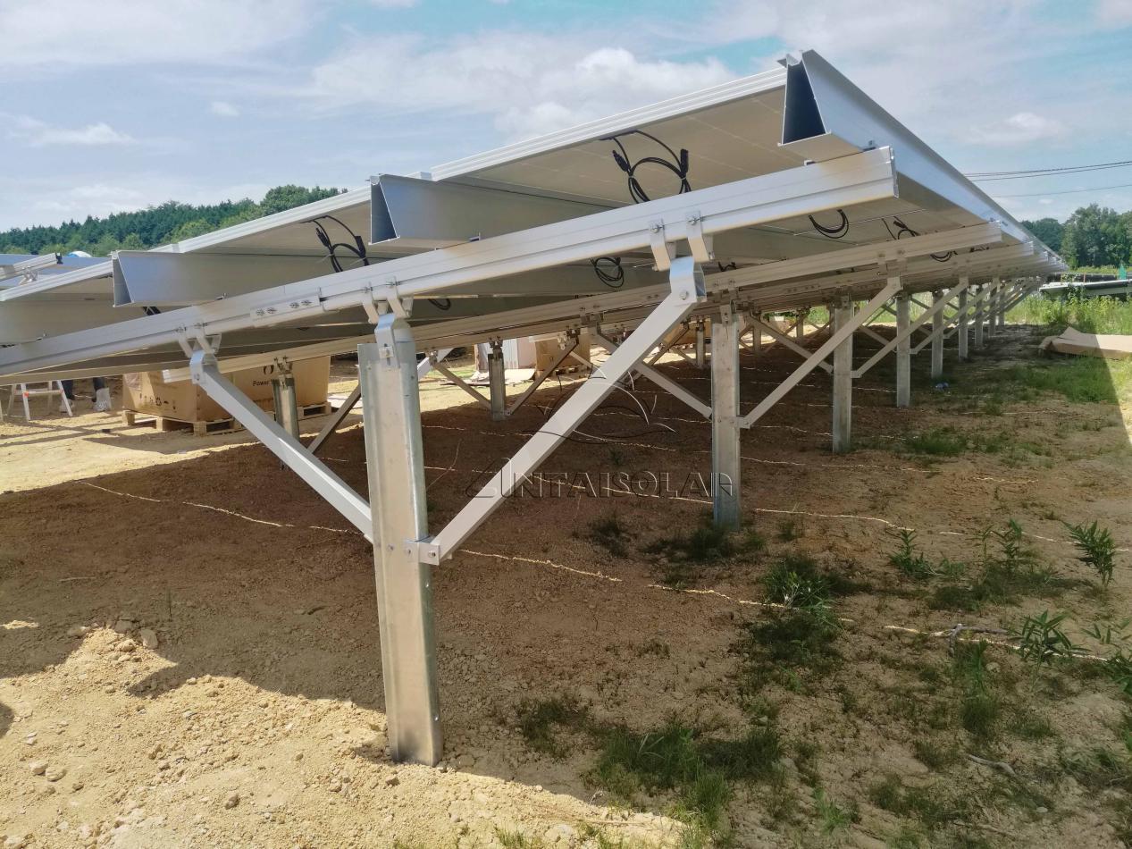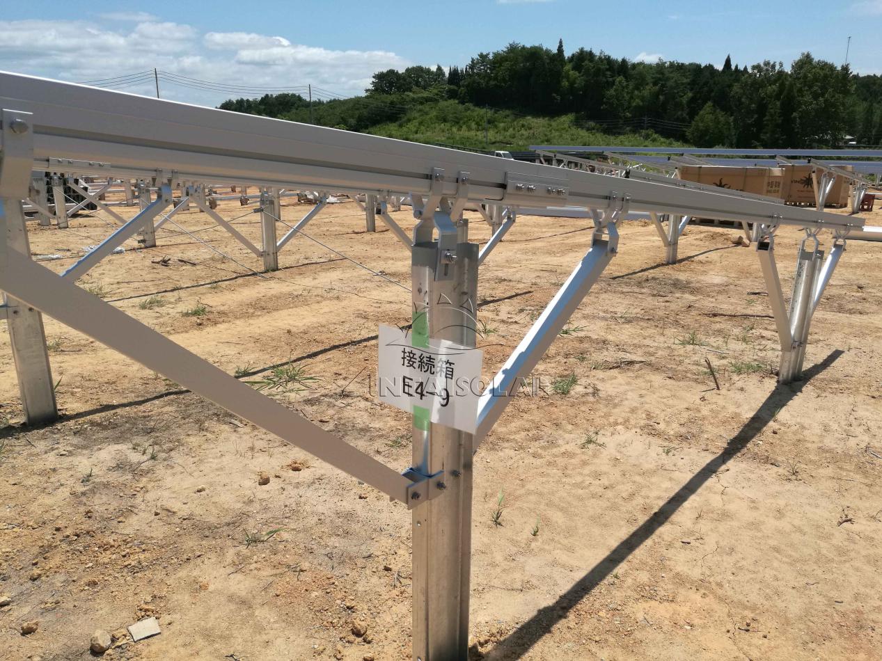 經過多次討論,最終為項目設計了幾字樁坡地東西可調支架解決方案。該支架采用幾字雙樁+雙支撐的設計,能很好地適應不同坡地地形;此外,利用大的跨距設計,結合打樁設備,充分提高了山地案件的施工效率。