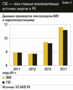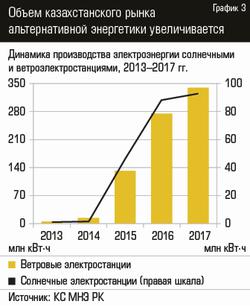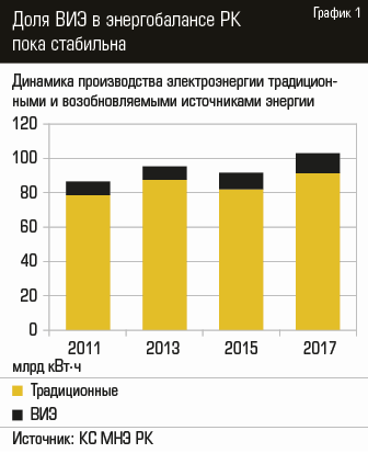 據NEM RK統計委員會,在過去十年可再生能源發電的總體比例為8-12%(見。圖1)。高利率相比,在過渡到“綠色”經濟的概念,指出 - 的統計數據的匯總水,風和太陽的能量,只是在最大的水電占幾乎全部來自可再生能源(參見圖2)的電力的功能的結果。憑心而論,應該指出的是,風力發電和太陽能發電在國內有了很大的發展,在過去幾年中(參見圖3)。只有在2017年,根據“電力能源和電力市場的運作報告,”哈薩克斯坦電力協會,在風力發電量達23.5%,產量的增加,這也讓他們采取的0股,占該國總發電量的3%。太陽能發電廠的產量增加 - 占2017年太陽能總發電量的4%,占0.1%。事實證明,太陽和風的總份額僅占該國總發電量的0.4%,為了實現這一概念的目標,共和國需要增加可再生能源的數量。在國家支持替代能源的條件下,這項任務看起來非常可行。