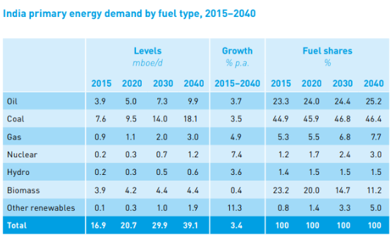 以印度和中國為首的發展中國家預計將占一次能源總需求增長的95%。報告指出,預計2015 - 2040年期間印度和中國的能源需求將分別增加約22 mboe / d和21 mboe / d。