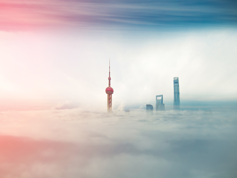 商業建筑沉浸在中國上海的霧中。盡管中國是世界上最大的溫室氣體排放國,但它現在正在引領綠色能源發展