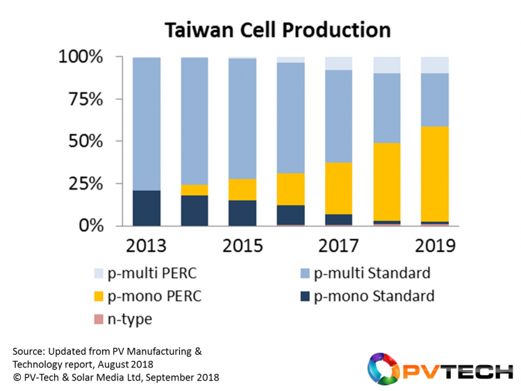 Mono-PERC于2014年在臺灣推出,但在2019年將成為主導電池類型,假設中國提供足夠的單晶圓供應。
