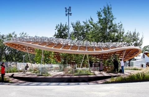 從遠處看,整個建筑呈水滴狀,它沒有所謂墻的隔閡,而是用一個竹鋼結構的屋頂去定義空間。這個屋頂呈透明,它有時候與地面相連,有時候又漂在半空中。“光能庭園家”本身既是建筑也是景觀,室內室外相互擁抱,最大限度的對自然開放,對陽光、空氣開放,它把陽光和自然作為人類生活和精神的一部分。而科技感十足的漢能薄膜太陽能是作品的重要組成,也是能量的來源,它將光能轉化為電能,從而用自然的資源去驅動人類起居空間的運行。