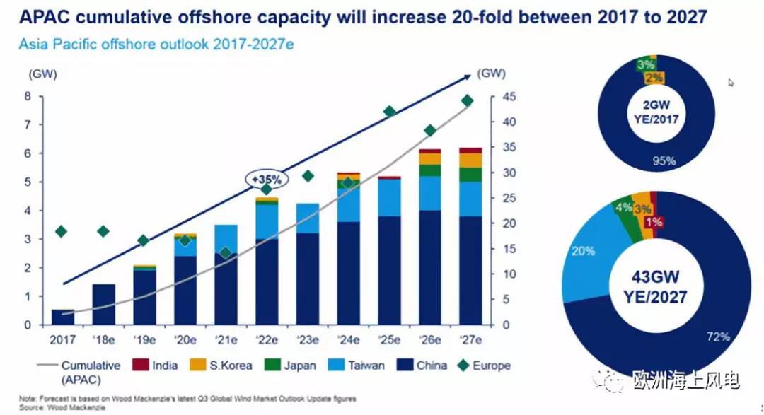 1、到2027年亞太地區(qū)海上風(fēng)電裝機(jī)容量較2017年增長20倍,裝機(jī)容量從2GW增長到43GW。平均年新增裝機(jī)超過4GW,年度復(fù)合增長率35%,發(fā)展前景可觀。