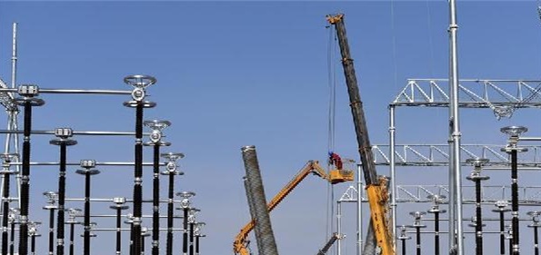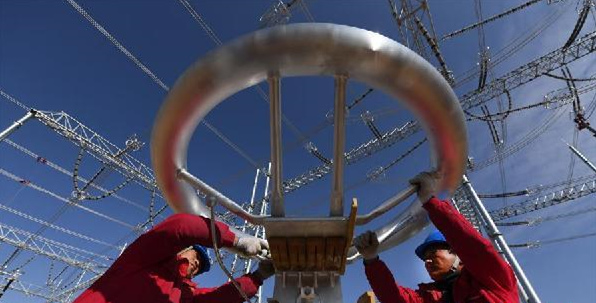 ↑11月6日,國家電網陜西省電力公司的工作人員在陜北風電基地750千伏集中送出工程定靖750千伏變電站進行隔離開關均壓環組裝。 新華社記者劉瀟攝