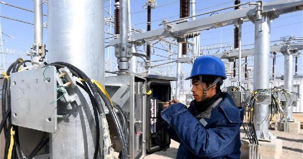 上圖為國家電網陜西省電力公司的工作人員在陜北風電基地750千伏集中送出工程定靖750千伏變電站進行二次回路查線。