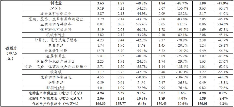 這說明,在碳市場(chǎng)機(jī)制的作用下,傳統(tǒng)行業(yè)原有的粗放式發(fā)展模式得到了約束,自然地遵從經(jīng)濟(jì)規(guī)律調(diào)整企業(yè)的產(chǎn)品結(jié)構(gòu),在單位增加值下能耗比最低,或者在單位能耗下增加值最高,最終實(shí)現(xiàn)了排放量和排放強(qiáng)度的雙重下降。