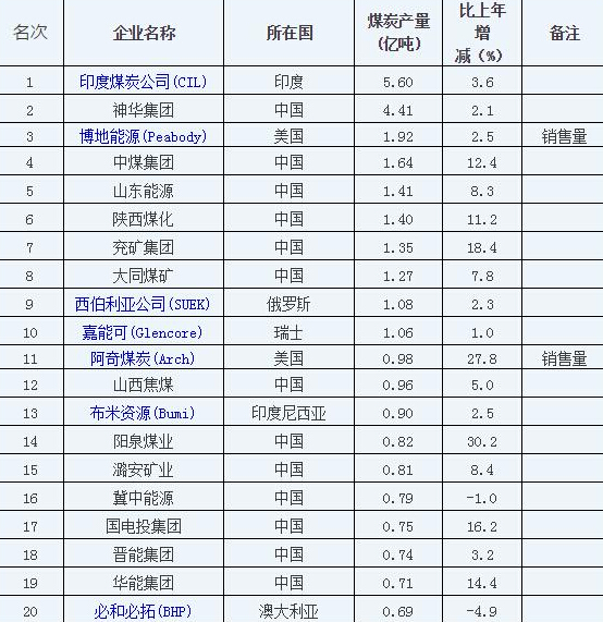2017年全球前20家煤企產量排名
