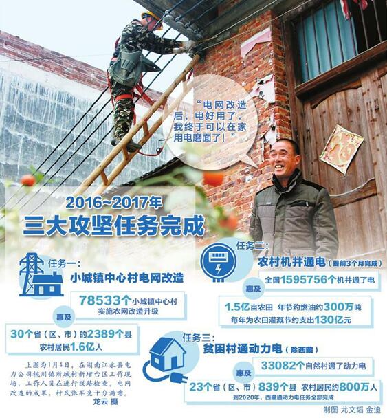 2017年12月,小城鎮中心村農網改造升級任務全面完成,合計為78533個小城鎮中心村實施農網改造升級,涉及30個省(區、市)的2389個縣,涉及農村居民1.6億人;
