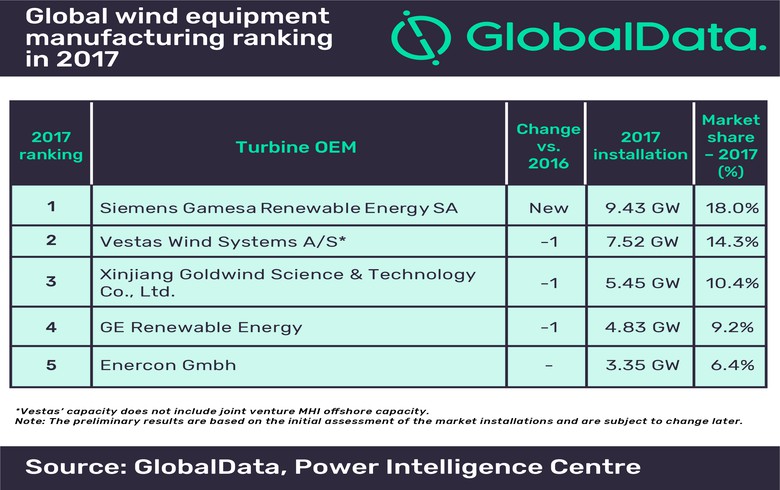 GlobalData補充說,2017年風電領域的前5名原始設備制造商(OEM)占總裝機容量的58%,比前一年增長近7%。