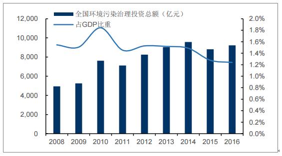 根據(jù)發(fā)達(dá)國(guó)家環(huán)保產(chǎn)業(yè)發(fā)展經(jīng)驗(yàn)來(lái)看,當(dāng)治理環(huán)境污染投資占GDP比例達(dá)到1%-1.5%時(shí),可以控制環(huán)境惡化的趨勢(shì);比重高達(dá)到3%時(shí)才能使環(huán)境質(zhì)量得到明顯改善,且投資高峰期一般可持續(xù)10年以上。中國(guó)的環(huán)境污染治理投資總額占比最高在2010年,達(dá)到1.84%,仍然未超過(guò)2%。截至2016年,占比下降到1.24%。2016年GDP總額為74.4萬(wàn)億,增速7.99%,假設(shè)到2020年GDP年復(fù)合增速為7%,環(huán)境污染治理投資總額達(dá)到2%,則2020年我國(guó)環(huán)境污染治理投資將有1.95萬(wàn)億元的空間。(74.4*(1+7%)^4*2%=1.95萬(wàn)億)。