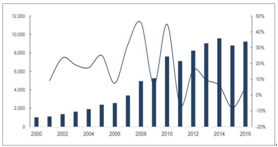 2000年-2016年國(guó)內(nèi)生產(chǎn)總值(億元)及增速(%)