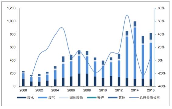 工業(yè)環(huán)保整體投資增速回升。全國(guó)工業(yè)污染治理完成投資總額在經(jīng)歷2013年的增速高峰后,于2014和2015年連續(xù)兩年下降,2015年呈現(xiàn)-22%的負(fù)增長(zhǎng)。到2016年整體投資額為819億元,增速回升至+6%,2017年的情況現(xiàn)在看來(lái)保持了較快的增長(zhǎng)勢(shì)頭。各項(xiàng)污染物治理中,廢氣治理投資占比較大,2016年整體投資額達(dá)到561億元,同比+8%。