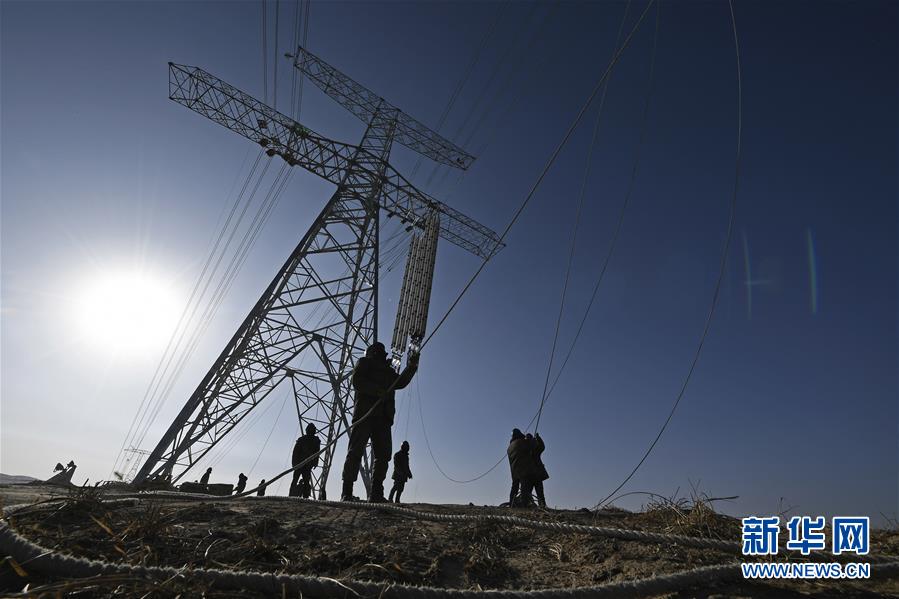 在昌吉——古泉±1100千伏特高壓直流輸電工程寧夏固原段,施工人員進(jìn)行線路貫通結(jié)尾工程作業(yè)