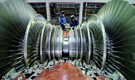 工人在唐山市曹妃甸工業(yè)區(qū)華潤(rùn)電廠二期工程工地安裝1000MW超超臨界燃煤發(fā)電機(jī)組設(shè)備(1月27日攝)。