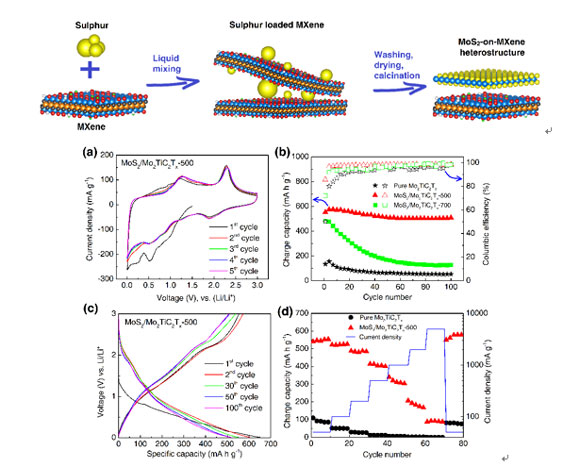 圖2MXene/MoS2異質(zhì)結(jié)構(gòu)合成示意圖及鋰離子存儲(chǔ)特性
