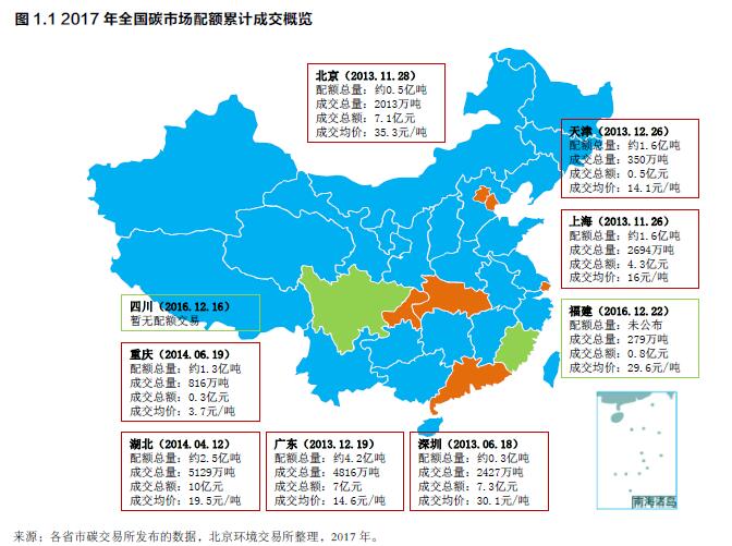 截至2017年底,已執(zhí)行或計劃執(zhí)行的碳定價區(qū)達(dá)到42個國家及25個地區(qū),包括:中國全國碳交易市場,中國七省市碳交易試點(北京、天津、上海、重慶、湖北、廣東、深圳)和四川、福建碳市場,日本東京都和埼玉縣碳市場,美國加州碳市場和覆蓋東部9個州的區(qū)域溫室氣體減排行動(RGGI),以及歐盟、新西蘭、瑞士、韓國、加拿大魁北克碳市場等。2017年,智利、哥倫比亞推出了碳稅,加拿大阿爾伯塔省、不列顛哥倫比亞省、安大略省、美國華盛頓州推出新的或加強型碳定價機制;墨西哥開始實施為期一年的碳排放交易系統(tǒng)刺激計劃,為2018年啟動碳排放交易體系試點做準(zhǔn)備;巴西、俄羅斯、泰國、土耳其、越南、哈薩克斯坦等國家正在考慮或籌備建設(shè)碳市場。
