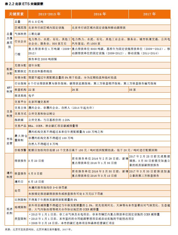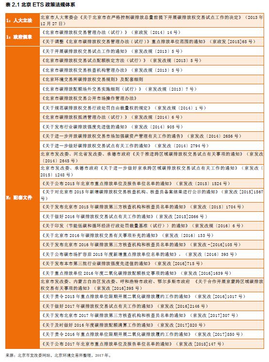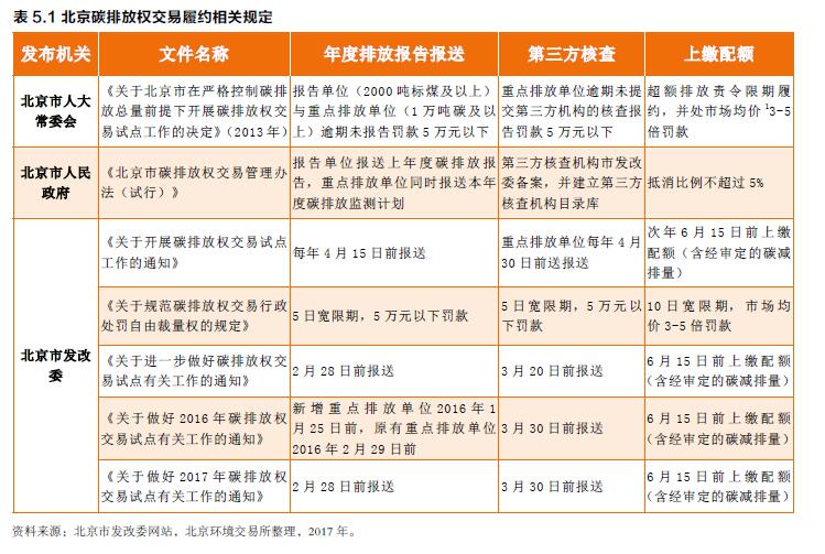 地方規(guī)范性文件。2016年12月,北京市發(fā)改委印發(fā)《關(guān)于做好2017年碳排放權(quán)交易試點有關(guān)工作的通知》,對947家重點排放單位和582家一般報告單位的碳交易履約工作提出具體工作部署,要求重點排放單位應(yīng)于2016年6月15日前,向注冊登記系統(tǒng)開設(shè)的配額賬戶上繳與其經(jīng)核查的2016年度排放總量相等的排放配額。