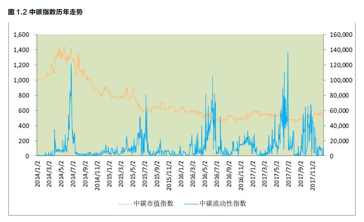 為了全面呈現(xiàn)試點碳市場(重慶碳市場由于交投樣本過低未納入統(tǒng)計)的碳價走勢及交易活躍程度,北京綠色金融協(xié)會2014年推出了中碳指數(shù),包括市值指數(shù)和流動性指數(shù)兩只指數(shù)1。2017交易年度,市值指數(shù)走勢相對平穩(wěn),基本維持在400點至600點區(qū)間震蕩,全年最高點為601.25點,最低點為433.68點,顯示2017年試點碳市場的配額價格已經(jīng)止跌趨穩(wěn),和2016交易年度基本持平,與2014和2015交易年度的碳價持續(xù)下跌形成鮮明對照。而流動性指數(shù)則繼續(xù)呈現(xiàn)出明顯的“階段效應(yīng)”,在履約期集中的5、6、7月交易異常活躍,而在履約期結(jié)束后指數(shù)快速下跌;后在全國碳市場消息較為頻繁的9、10月,市場交易再度活躍。