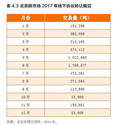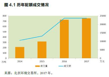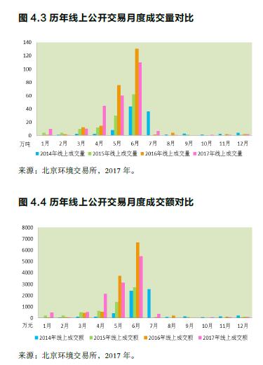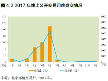 自2013年11月28日開市至2017年12月31日,北京碳市場累計成交配額2013萬噸,交易額7.11億元。其中線上公開成交727萬噸,交易額3.64億元;線下協(xié)議轉(zhuǎn)讓成交1286萬噸,交易額3.47億元。