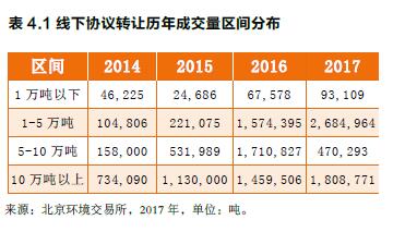 從月度分布情況看,線下協(xié)議轉(zhuǎn)讓集中發(fā)生于5、6月,兩個月成交量281.25萬噸,占全年協(xié)議轉(zhuǎn)讓成交總量的55.6%,反映出履約沖刺期部分履約機構(gòu)強勁的大宗購買需求。與上年度協(xié)議轉(zhuǎn)讓成交情況相比,2017年單筆1萬噸以下,10萬噸以上的協(xié)議轉(zhuǎn)讓成交增幅明顯,分別為37.78%和23.93%;1-5萬噸的協(xié)議轉(zhuǎn)讓成交呈現(xiàn)大幅增加,增幅為70.54%。