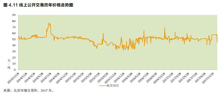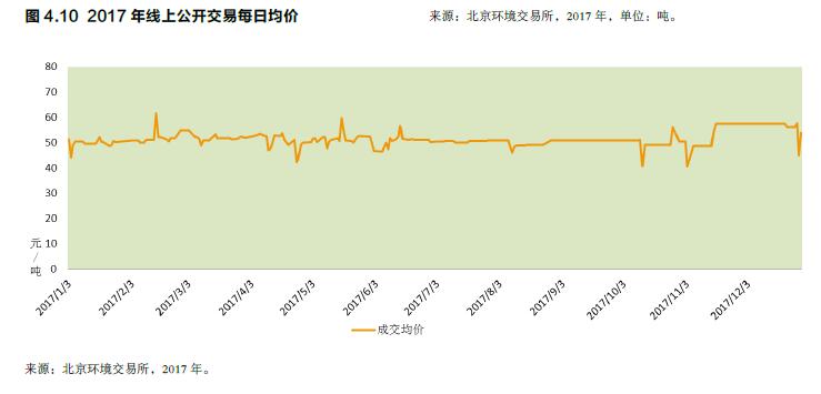 價格走勢。2017年度北京碳市場首個交易日的公開交易成交均價為51.36元/噸,最后一個交易日的公開交易成交均價為54.00元/噸,全年公開交易的成交均價為49.95元/噸。最高單日成交均價為61.60元/噸(2月15日),最低單日成交均價為40.6元/噸(11月3日)。單筆交易成交價最高為71.80元/噸(5月18日),最低為33.90元/噸(4月26日)。從線上公開交易價格走勢看,2017年履約期間,市場價格在相對高位波動較為頻繁,市場價格中樞維持在50元/噸左右;隨著履約期的結(jié)束,成交量開始下降,市場價格波動也有所減緩。7月份之后,配額價格基本穩(wěn)定在40-60元/噸區(qū)間。