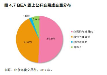 2017年,北京碳市場線上公開交易月度成交仍然主要集中在履約期期間。隨著重點排放單位于3月陸續(xù)完成排放報告編制工作,基本確定市場表現(xiàn)自身配額需求,市場開始進入活躍期,交易量逐月提高。3、4月份市場開始預(yù)熱,進入5、6月份線上成交量迅猛增長,占全年線上成交量的68.83%,成交額占69.36%。隨著市場逐步成熟穩(wěn)定,2017年較2016年相比配額線上總體交易情況相差不大,但因履約期市場供需的共同釋放仍集中于5-6月份。雖然經(jīng)過前三年試點,重點排放單位履約意識不斷加強,但多數(shù)受限于自身業(yè)務(wù)結(jié)構(gòu),靈活運用碳資產(chǎn)的經(jīng)驗仍然不足,大多在5月履約工作啟動后才開始入市購買配額,導(dǎo)致在6月履約進入沖刺階段后累積了大量剛性需求,帶動市場交易量在履約期間快速增長。市場參與情況。截至2017年12月31日,北京碳市場累計申請開戶逾947家,其中履約機構(gòu)仍占絕大多數(shù)。與去年相比,2017年新增開戶企業(yè)主要為CCER投資機構(gòu)。全年的BEA線上公開交易中,共有近500家機構(gòu)和自然人參與過交易。其中,履約機構(gòu)與履約機構(gòu)之間的交易占總筆數(shù)的1.80%,占總成交量的1.86%,較去年均有明顯降低;履約機構(gòu)與非履約機構(gòu)之間的交易占總筆數(shù)的48.88%,較去年有小幅增長,占總成交量的41.85%,較去年有小幅降低;非履約機構(gòu)之間的交易占總筆數(shù)的42.47%,占總成交量的50.84%,較去年均有明顯增長;自然人參與的交易占總筆數(shù)的6.85%,占總成交量的5.44%,較去年均有小幅降低。根據(jù)市場參與情況,非履約機構(gòu)參與的交易呈明顯增長趨勢,不難看出非履約機構(gòu)在活躍市場氛圍、增強市場流動性等方面發(fā)揮了重要的作用。