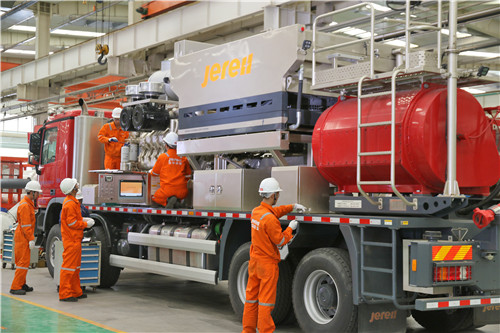 壓裂車是專門開采頁(yè)巖氣的高端油氣設(shè)備,杰瑞自主研發(fā)的“阿波羅一號(hào)”渦輪壓裂車,搭載了用于直升機(jī)的5600馬力的渦輪發(fā)動(dòng)機(jī),可以在游艇上使用的高速減速箱,全球油田領(lǐng)域水馬力最大的柱塞泵,將清潔能源頁(yè)巖氣開采效率整整提高一倍。