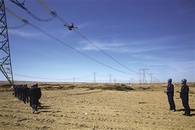 “無人機準備就緒,可以起飛……”3月9日,在我省白銀市境內一處荒野,一架紅色電動無人機緩緩升起,開始沿著這里經過的±800千伏天中直流2210號塔身平穩飛行、精準查找隱患。在現場工作的國網甘肅檢修公司輸電檢修中心主任成保告訴記者:“現在隨著高科技的應用,我們的巡線變成了‘無人機+望遠鏡+步行’,傳統方式與高科技的結合,讓日常的巡線查隱患工作更完善。”