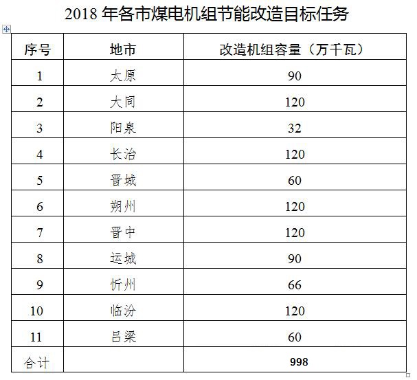 為加快推進全省燃煤電廠節(jié)能改造,進一步提升煤電機組能效水平,確保完成《國家發(fā)展改革委環(huán)境保護部國家能源局關于印發(fā)煤電節(jié)能減排升級與改造行動計劃(2014—2020年)的通知》(發(fā)改能源〔2014〕2093號)和《環(huán)境保護部國家發(fā)展改革委國家能源局關于印發(fā)全面實施燃煤電廠超低排放和節(jié)能改造工作方案的通知》(環(huán)發(fā)〔2015〕164號)提出的現(xiàn)役煤電機組供電煤耗目標任務,按照《山西省燃煤電廠節(jié)能改造實施方案(2016-2018年)》(晉經(jīng)信節(jié)能字〔2016〕239號)有關要求,根據(jù)全省“十三五”前兩年煤電機組節(jié)能改造進展情況,結合各市上報的2018年煤電機組節(jié)能改造計劃,經(jīng)研究,現(xiàn)將今年煤電機組節(jié)能改造目標任務及有關要求通知如下: