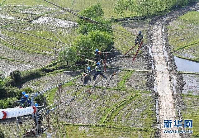 4月8日,在安徽省蕪湖市繁昌縣境內,安徽送變電工程有限公司施工人員在70多米高的導線瓷瓶上作業。