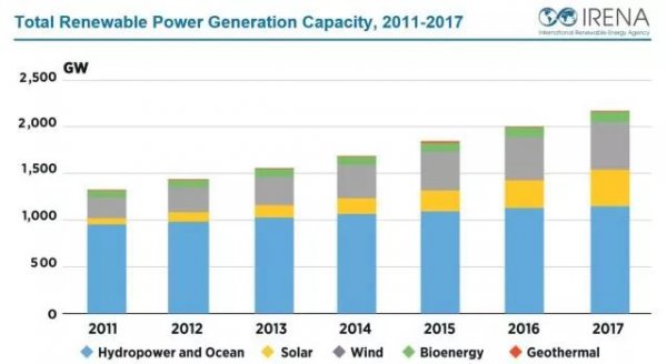 國際可再生能源機構(IRENA)發布的新數據顯示,2017年全球可再生能源發電容量增加167GW,達到2179GW。 這意味著一年約增長8.3%。