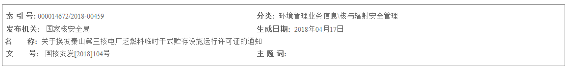 關于換發(fā)秦山第三核電廠乏燃料臨時干式貯存設施運行許可證的通知