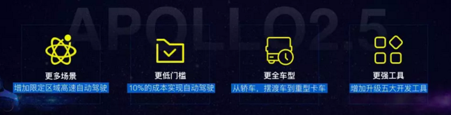 2018年4月19日——在百度宣布推出Apollo計劃整整一周年后,這家互聯(lián)網(wǎng)巨頭于北京競園藝術中心舉行了“Apollo Meetup——Apollo2.5 開放技術發(fā)布會”,正式對外發(fā)布Apollo 2.5版本。與之前的版本相比,本次 Apollo2.5在更多場景、更低門檻、更全車型、更強工具四個方面進行了拓展,可滿足開發(fā)者的更多需要。