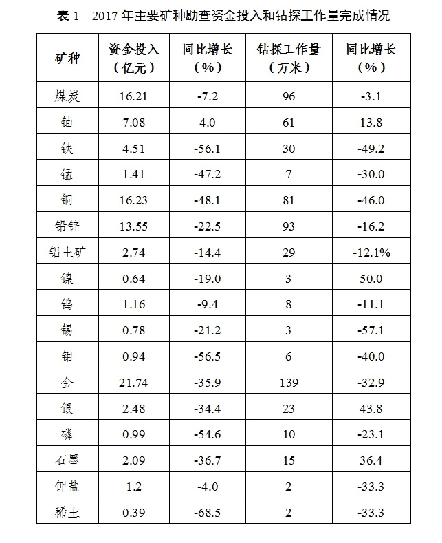 日前,自然資源部發布《2017年全國地質勘查成果通報》。《通報》顯示,2017年我國地質勘查投入延續了近年來的下滑態勢,以2012年為拐點,繼續下行。全國地質勘查投入資金198.36億元,同比減少19.8%。從資金投入看,礦產勘查投入資金120.61億元,同比減少29.0%。其中,以金(21.74億元)、銅(16.23億元)、煤炭(16.21億元)、鉛鋅(13.55億元)、鈾(7.08億元)為主,占總投入的62.0%。與2016年相比,鈾礦投入同比增加4.0%,稀土、鉬、鐵、磷、銅、錳、石墨、金、銀等礦種投資降幅較大。