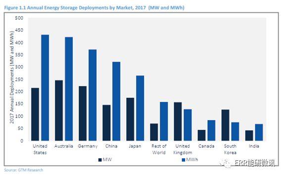 2017年是儲能領(lǐng)域最激動人心的年份之一,多個市場出現(xiàn)了形成性的政策發(fā)展、有趣的商業(yè)模式以及一股企業(yè)的兼并和收購活動。2017年,全球共部署了1.4吉瓦和2.3吉瓦小時的儲能,其中澳大利亞在電力容量方面處于領(lǐng)先位置,達到246兆瓦,而美國市場在能源容量方面領(lǐng)先全球,達到431兆瓦時。