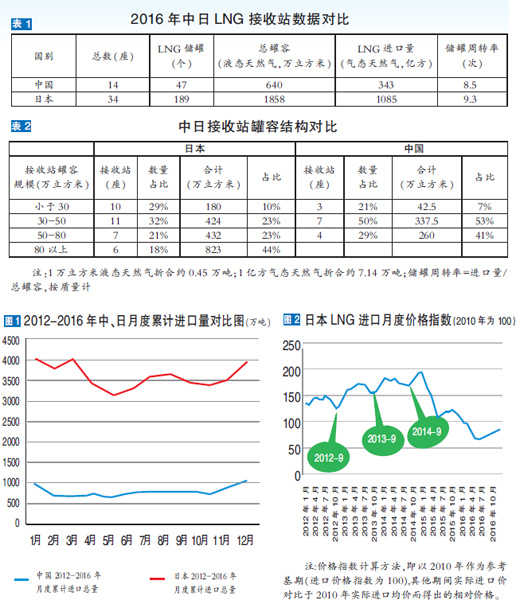 從LNG進(jìn)口價格上看(如圖2),2012-2016年,除2015年后LNG價格受國際原油價格下跌影響外,2012-2014年的7-9月均是一年中LNG的價格低谷期,日本利用LNG接收站的較大罐容,在每年的三季度低價采購LNG,用于冬季調(diào)峰。而我國接收站罐容較小,基本為周轉(zhuǎn)用罐容,無季節(jié)調(diào)峰用罐容,所以,只能在冬季LNG價格較高時,加大采購量以滿足冬季調(diào)峰需求。